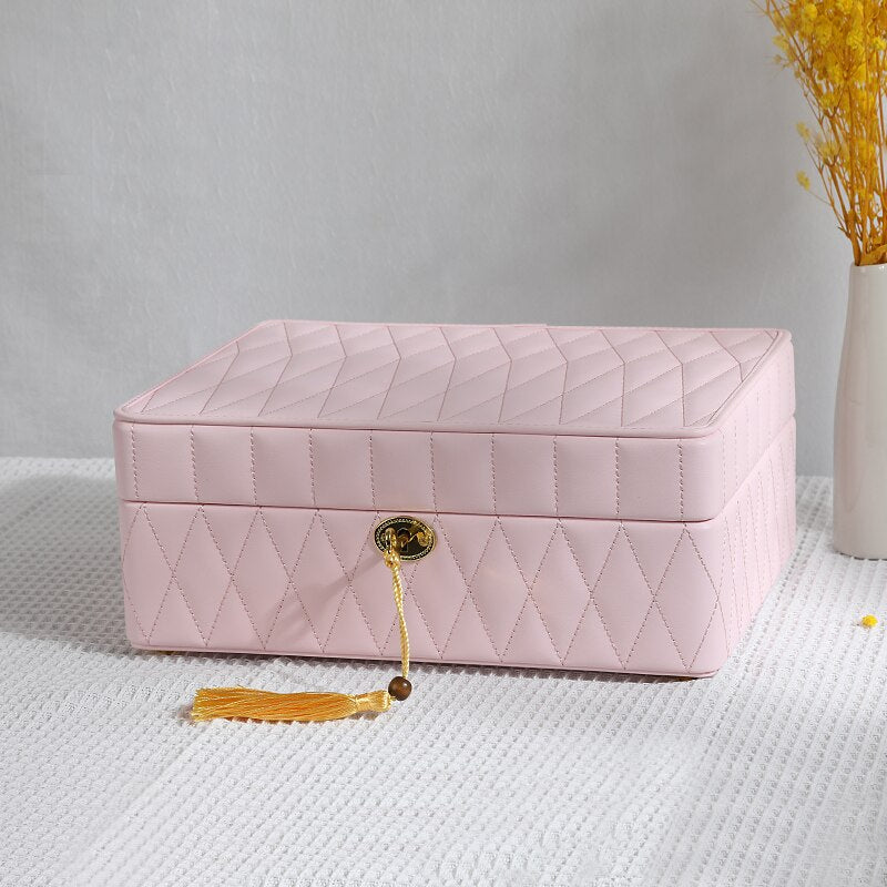 Känn lyxen varje gång du öppnar detta skrin för att välja dina smycken för dagen. Inredningen är noggrant utformad för att hålla varje örhänge, halsband och armband på plats, skydda mot repor och trassel. Med en kombination av elegans och praktisk förvaring är detta skrin ett måste för alla smyckeentusiaster. Låt varje detalj, från det broderade locket till dess mjuka interiör, tala till ditt sinne för stil och organisation.