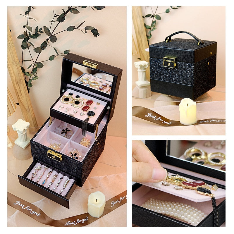 Med sitt glamorösa yttre av svart glitter, framhäver detta smyckeskrin din personliga stil och smak. Dess multipla fack och lådor hjälper dig att hålla ordning på ringar, halsband och örhängen. Det inbyggda spegeln gör det enkelt för dig att prova dina smycken innan du går ut. Notera den robusta konstruktionen som ger ett hållbart skydd för dina värdefulla skatter.