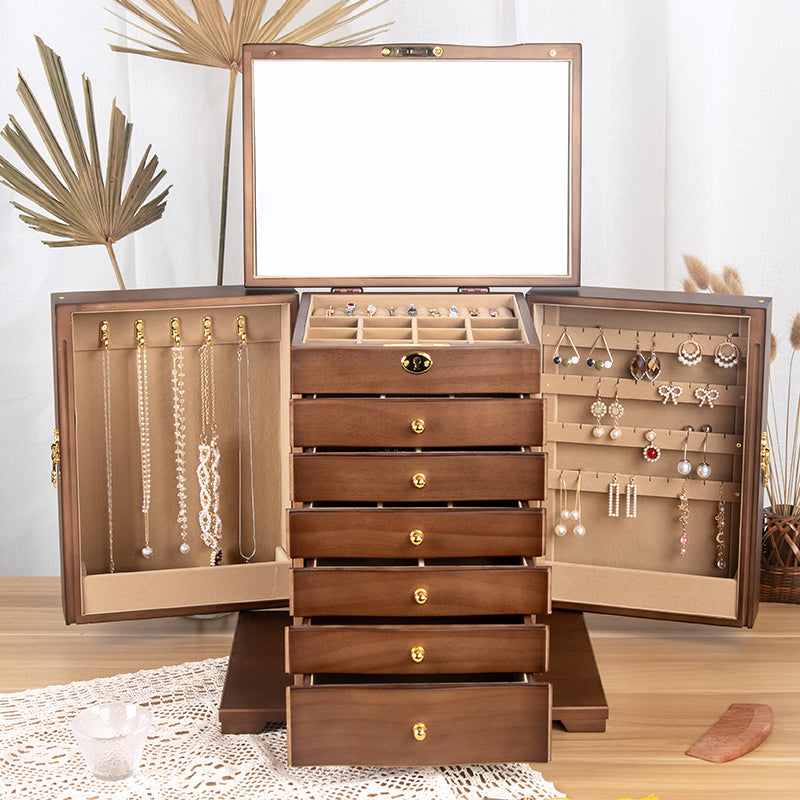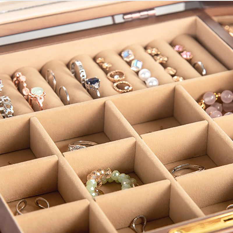 Förutom att erbjuda rikligt med förvaringsutrymme, är smyckeskrinet utrustat med en stor spegel för enkel påklädning och en mjuk vadderad insida för att skydda era smycken från repor och skador. Att dela detta praktiska tillbehör gör er morgonrutin både smidigare och mer harmonisk. Låt vår produkt förhöja er vardag med stil och funktionalitet.