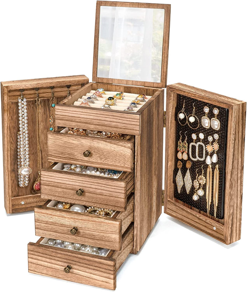 Vårt smyckeskrin har flera unika egenskaper som skiljer det från andra på marknaden. Den rymliga interiören med flera avdelningar håller dina smycken organiserade och lätta att hitta. Den inbyggda spegeln ger dig möjlighet att enkelt prova dina smycken och skapa den perfekta looken för dagen. Dessutom ger den handgjorda finishen en personlig touch som värdesätts av våra kunder. Oavsett om du är en smyckesfantast eller söker den perfekta presenten, kommer detta skrin inte att göra dig besviken.