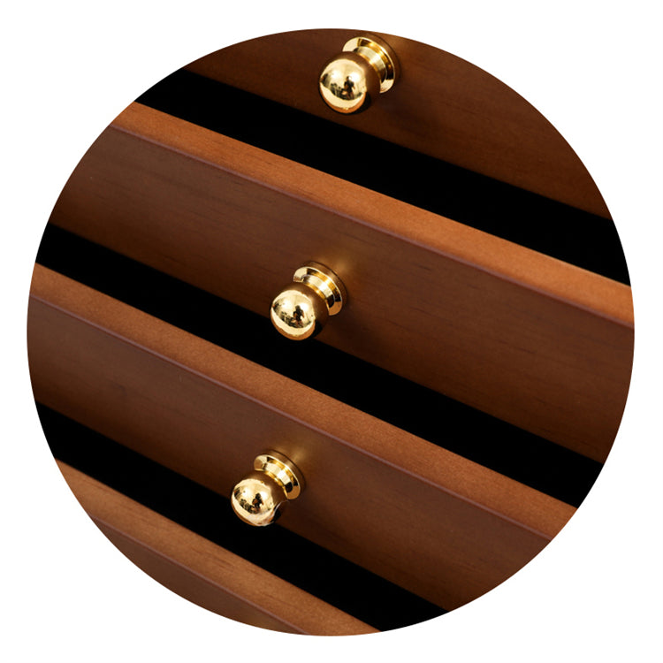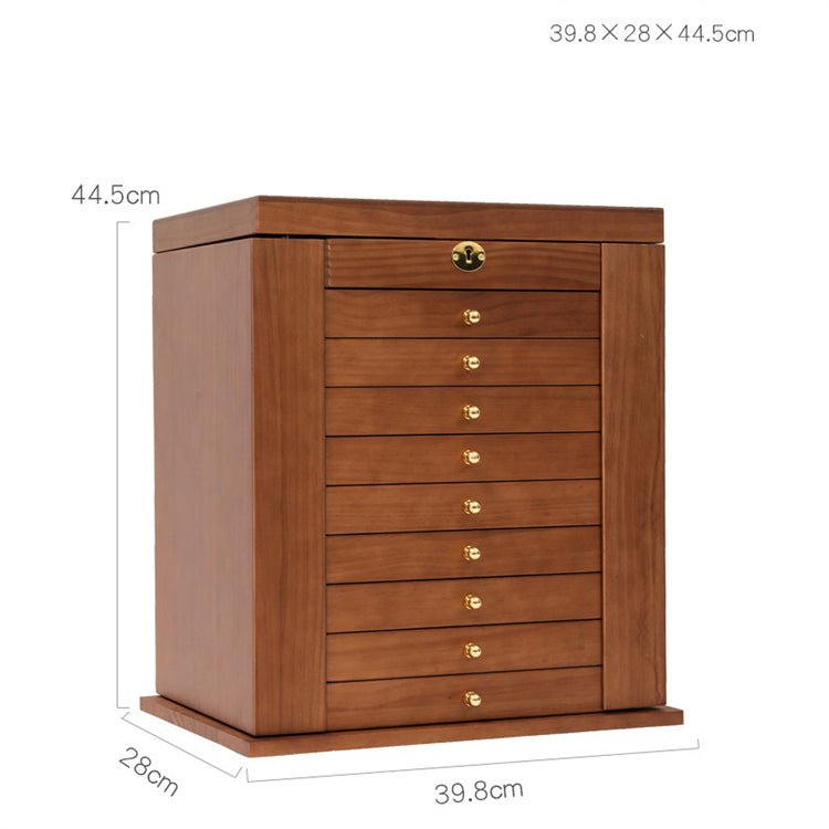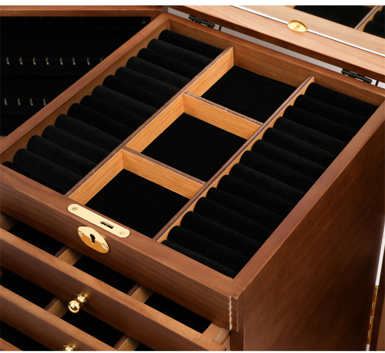 Inte bara ett skrin, utan en lyxig piedestal för dina älskade smycken! Vårt stora smyckeskrin i trä ger dig möjligheten att organisera med stil. Varje aspekt av skrinet har skapats med ett noggrant öga för detaljer, från dess mjuka foder som skyddar mot repor, till de rymliga lådorna som rymmer varje slags smycke du äger. Med sin robusta konstruktion kan du vara säker på att ditt skrin kommer att hålla i många år framöver, samtidigt som det berikar ditt rum med en touch av elegans och värme.